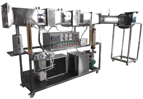 制冷壓縮機組,冷凝器,蒸發(fā)器,離心風機,電熱加濕裝置,一次、二次加熱裝置,數(shù)顯溫度儀表,壓差計(±100Pa),超壓保護裝置,壓力表(-0.1-2.5 Mpa),轉子流量計,熱電偶,電流表,電壓表,風量測量裝置(笛形管),不銹鋼臺架及控制柜等。