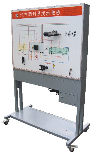 本產(chǎn)品選用大眾汽車雨刮系統(tǒng)實物,展示汽車雨刮系統(tǒng)的結(jié)構(gòu)與原理;面板上繪有完整的雨刮系統(tǒng)的電路圖,設(shè)置有檢測端子,可通過儀器儀表檢測各種信號參數(shù)如電壓、電阻、頻率等。