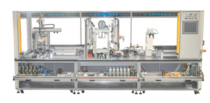 工業(yè)機器人模擬汽車鈑金沖壓集成制造實訓系統(tǒng)是公司為汽車生產(chǎn)企業(yè)設計制作的一套模 擬沖壓生產(chǎn)線,主要由臺架、自動拆垛系統(tǒng)、自動傳輸系 統(tǒng)、沖壓機系統(tǒng)、線尾出料系統(tǒng)及電氣集成控制系統(tǒng)等系統(tǒng)單元組成,裝置下方安裝有控制器可供學員學習安裝接 線及控制訓練,是一套真實模擬大型沖壓件生產(chǎn)工藝,展 現(xiàn)自動化沖壓生產(chǎn)線結構、工作原理,能夠進行產(chǎn)線問題 分析、控制操作、學員實訓、對外演示的自動化裝置,工業(yè)機器人模擬汽車鈑金沖壓集成制造實訓系統(tǒng)由臺架,自動拆垛系統(tǒng),自動傳輸系統(tǒng),沖壓機系統(tǒng),線尾出料系統(tǒng)和電氣集成控制系統(tǒng)組成。 大型沖壓件生產(chǎn)的需求而具備較高的生產(chǎn)效率、穩(wěn)定的產(chǎn)品質量以及規(guī)模生產(chǎn)條件下更低的單件生產(chǎn)成本等眾多優(yōu)點的自動化沖壓生產(chǎn)線越來越多的逬入了生產(chǎn)車間,而該模擬沖壓生產(chǎn)線能夠高效的完成自動化沖壓生產(chǎn)線的產(chǎn)前模擬,提供了一套真實模擬環(huán)境。